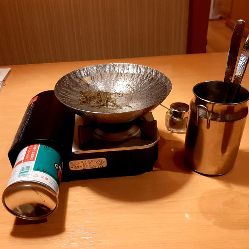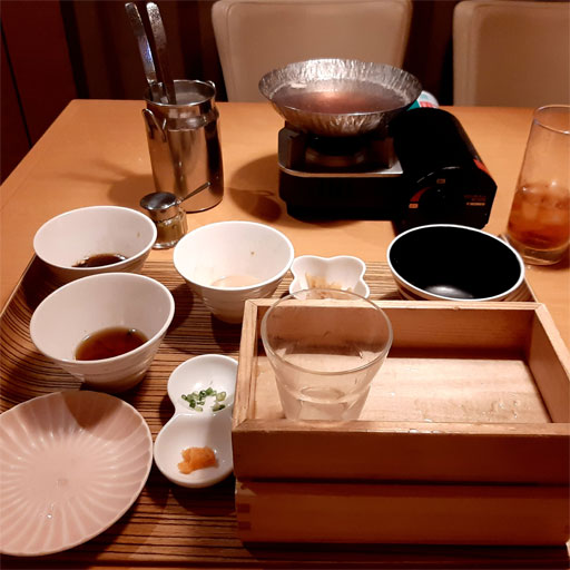 しばらくすると同じ従業員の女が現れ,テーブルの上に食器や食材を並べ終わると姿を消した。従業員は始終,無言だった。「お待たせいたしました。準備が終わりました」くらい言うのかと思っていたが,それもなし。